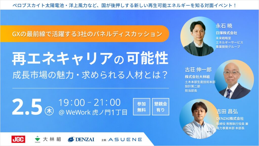 2026年2月5日(木)に開催される、アスエネ株式会社が主催「再エネキャリアの可能性 ー成長市場の魅力・求められる人材とは?」に弊社 専務執行役員 風力事業本部本部長 吉田 昌弘 がパネルディスカッションに登壇いたします。